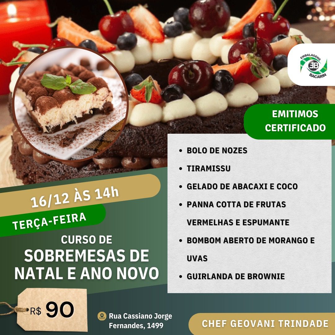 Curso de Sobremesas de Natal e Ano Novo dia 16/12/2025 - Terça-feira 14h - Embalagens Bacarin
